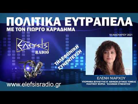Η Ελένη Νιάρχου, υποψήφια βουλευτής της ΕΛΛΗΝΩΝ ΣΥΝΕΛΕΥΣΙΣ, στο ΕΛΕΥΣΙΣ Radio και την εκπομπή ΠΟΛΙΤΙΚΑ ΕΥΤΡΑΠΕΛΑ, με τον Γιώργο Καραδήμα.