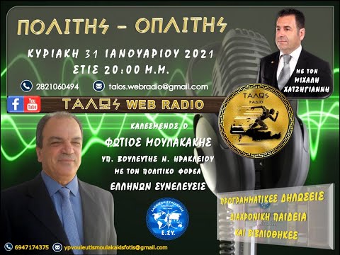 ΥΠ.ΒΟΥΛΕΥΤΗΣ ΗΡΑΚΛΕΙΟΥ ΦΩΤΗΣ ΜΟΥΛΑΚΑΚΗΣ ΜΕ ΤΗΝ ΕΛΛΗΝΩΝ ΣΥΝΕΛΕΥΣΙΣ ΚΑΛΕΣΜΕΝΟΣ ΣΤΗΝ ΕΚΠΟΜΠΗ (ΠΟΛΙΤΗΣ ΟΠΛΙΤΗΣ) ΤΟΥ ΡΑΔΙΟ ΤΑΛΩΣ ΜΕ ΤΟΝ ΜΙΧΑΛΗ ΧΑΤΖΗΓΙΑΝΝΗ
