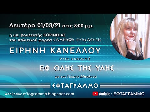 ΣΤΗΝ ΕΚΠΟΜΠΗ ΕΦ ΟΛΗΣ ΤΗΣ ΥΛΗΣ ΜΕ ΤΟΝ ΜΠΑΛΝΤΑ ΓΕΩΡΓΙΟ ΤΗΝ ΔΕΥΤΕΡΑ 01/03/2021 ΣΤΙΣ 20:00 ΚΑΛΕΣΜΕΝΗ Η κα ΚΑΝΕΛΛΟΥ ΕΙΡΗΝΗ ΥΠΟΨΗΦΙΑ ΒΟΥΛΕΥΤΗΣ ΜΕ ΤΟΝ ΠΟΛΙΤΙΚΟ ΦΟΡΕΑ ΕΛΛΗΝΩΝ ΣΥΝΕΛΕΥΣΙΣ ΣΤΟΝ ΝΟΜΟ ΚΟΡΙΝΘΙΑΣ ΣΤΟ web radio ΕΦΤΑΓΡΑΜΜΟ (https://eftagrammo.blogspot.com) & ΣΤΟ youtube channel ΕΦΤΑΓΡΑΜΜΟ (https://bit.ly/eftagrammosub) ΔΙΑΒΑΣΕ ΤΟ ΑΡΘΡΟ ΕΔΩ: https://esypeloponnisou.wordpress.com... ------------------------------------------------------------------ ΣΤΟΙΧΕΙΑ ΕΠΙΚΟΙΝΩΝΙΑΣ ΥΠΟΨΗΦΙΑΣ ΒΟΥΛΕΥΤΗ twitter: https://twitter.com/EKanelou instagram: https://www.instagram.com/eirini___ka... blog: https://eirini-kanellou.blogspot.com